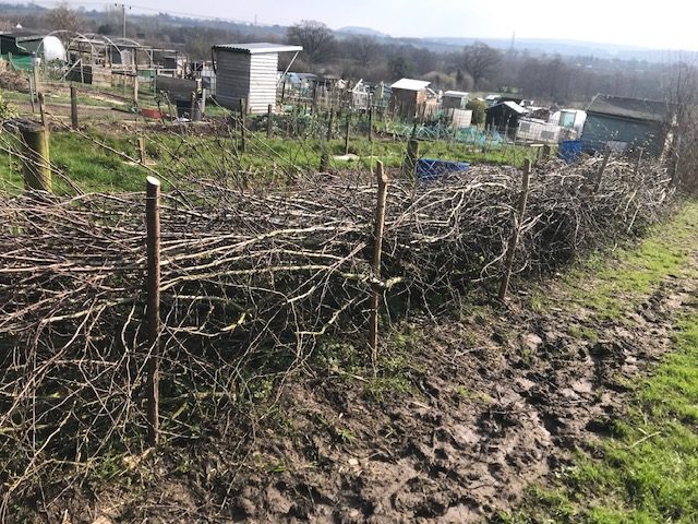 Frome Town Rangers have laid a new hedge at Muriel Jones Field allotments. Hedge laying is a traditional countryside skill.